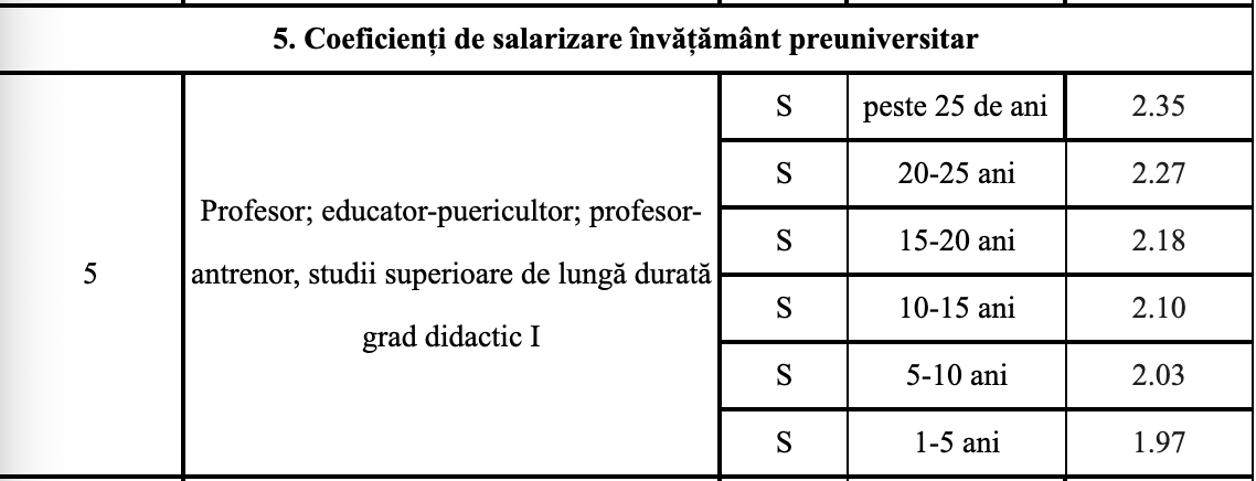 Un profesor cu grad didactic I, cu studii superioare și vechime de peste 25 de ani, va obține un salariu de 10.163,75 de lei brut pe lună, în timp ce unul cu grad didactic I însă cu o vechime de 1-5 ani 8520.25 de lei.