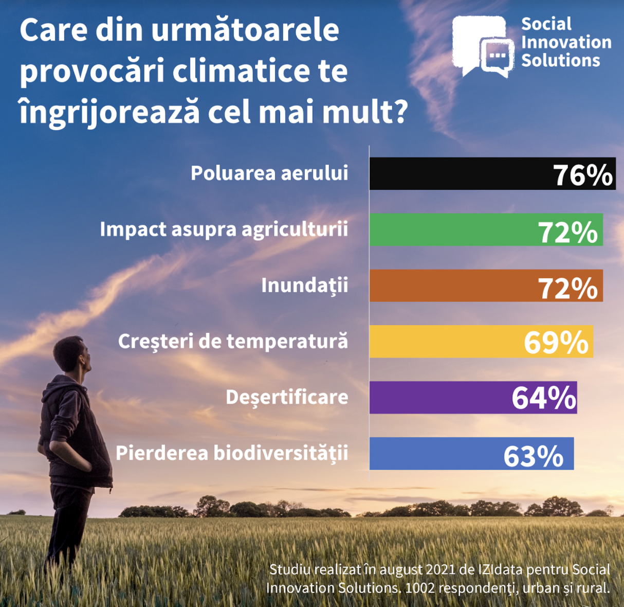 Atunci când vine vorba despre gravitatea provocărilor climatice, poluarea aerului este pe primul loc ca gravitate percepută, 76% dintre respondenți declarându-se îngrijorați de aceasta, urmată de impactul negativ asupra agriculturii (72%) și de inundații (72%). Creșterea nivelului mării este pe ultimul loc, 1 din 2 respondenți declarându-se însă îngrijorați și de acest aspect. Pentru persoanele de peste 55 de ani însă, comparative cu cele între 15 și 24 de ani, diferențele de îngrijorare sunt mari: dacă impactul asupra agriculturii îngrijorează mult și foarte mult 81% dintre persoanele de peste 55 ani, doar 68% dintre tinerii sub 24 de ani sunt îngrijorați de acest aspect. Diferențe asemănătoare se pot observa și când vine vorba despre deșertificare sau pierderea biodiversității.