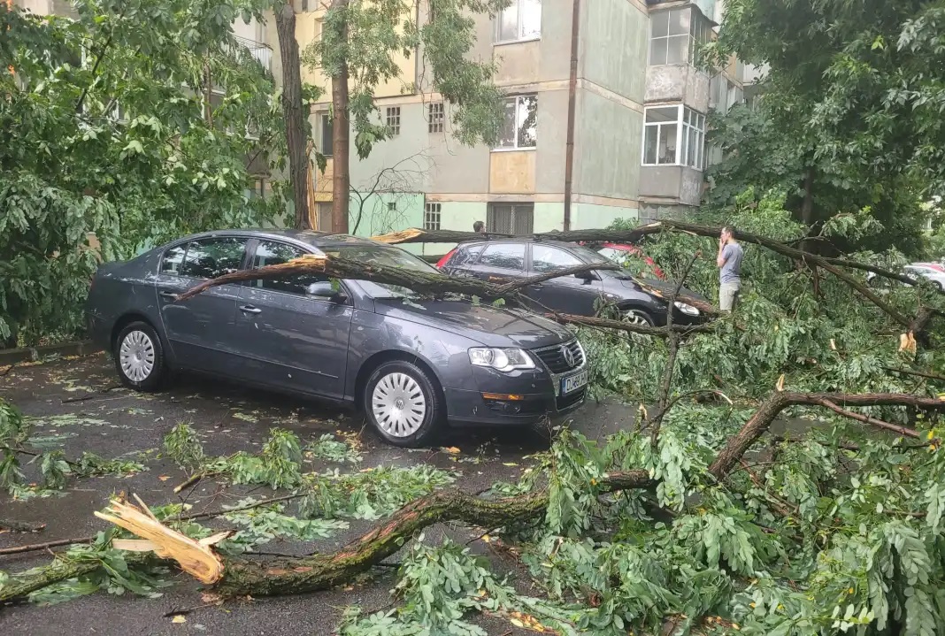Dezastru făcut de vânt în București. Zeci de mașini au fost avariate de copacii căzuți, o persoană rănită VIDEO