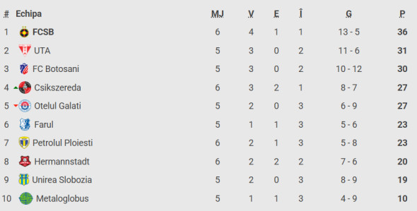 După victoria cu Petrolul, FCSB e lider în play-out, cu 36 de puncte, urmată de UTA (31 de puncte) şi FC Botoşani (30 de puncte), ambele însă cu câte un meci mai puţin disputat.