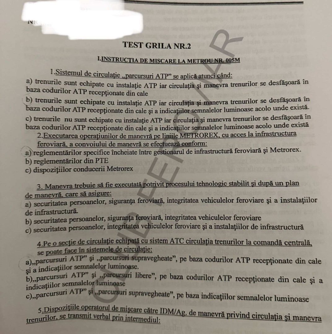 Într-o altă imagine cu un test grilă pentru angajații Metrorex vedem cum răspunsurile corecte la testele grilă au întotdeauna un punct la final, pe când celelalte nu.